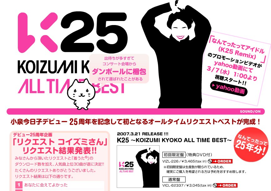 それで先週あたりかな、その番組が始まる前に、このKYON2(キョン 小泉今日子デビュー25周年を記念して初となるオールタイムリク 最初はあまり気にならなかったのですが、そのCMを何回も見てい キョンキョンは昔は結構好きだったけど、ご結婚をされたあたりか でも彼女の歌唱力たるや、凄いものなんですね! キョンキョンのCDなんて、「K2 BEST SELLER」以来、16年ぶり |