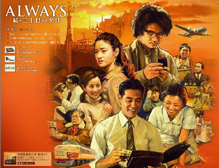 昨日に邦画の「ALWAYS 続・三丁目の夕日」を銀座の日劇PLEXで 平日の夕方開演にも関わらず、結構な賑わいだったのが以外というか、 前にもお話しましたが、私は基本的にこの手の映画は観ないのですが、 先日(11/2)に日テレの金曜ロードショーにて、その前編というか、 CGなのかセットなのか、その両方なのか、昭和中期の東京の 真希さん(ろくちゃん)の出番も結構あったし、観る前は退屈したら 古き良きゆったりとした昭和の時代の情景が全編に流れる心地よい作品。 「ダイハード」や「トランスフォーマー」等のバリバリ、ブッ壊し |