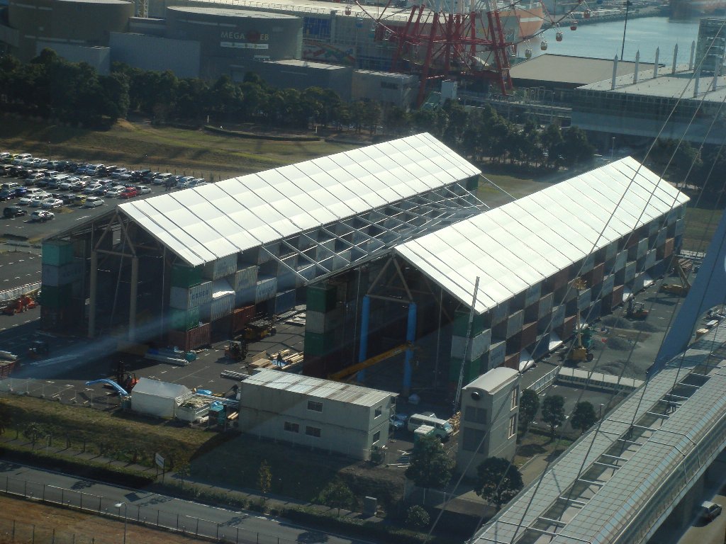 壁の様に積まれたコンテナ群に屋根が付けられ、2棟の建物に変貌していた。 謎が少しずつ解明されてきたが、この建物が一体何の為に建築されたのかは、まだ解らないのである。何かのイベントにでも使われるのだろうが、それが何かは未だに不明。 上下左右一つおきにコンテナ1個分の空間があるので、密閉された空間では無いだろうから中に何を置くのか甚だ興味深いのである。 まあ、また何か分かりましたら、更なる続報をお届けしましょう。ううむ、それにしても謎だ。 |
