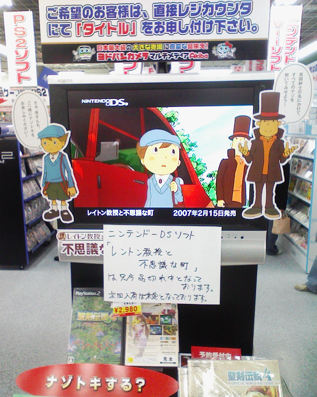 もの凄い人気である! 立地がアキバという集客力が成せる技なのか、はたまた堀北真希効果(?)なのか、それとも、もともと人気のあるソフトなのか・・・。 私は昨日にヨドバシカメラ・マルチメディア横浜にてゲットしていたので影響なしでしたが(よかった、よかった!)、一日遅れていたら横浜でも売り切れていたのだろうか?! 当のソフトをプレイしてみました。初っ端からルーク少年(真希ちゃん)の声だったので感激です(けど、イメージとあまり結び付かない・・・)! まだ始めて間もないのですが、無事にエンディングまで辿り着くことが出来るのであろうか・・・(飽きっぽいので途中で終わることが多いんですよね(^_^;))。 |